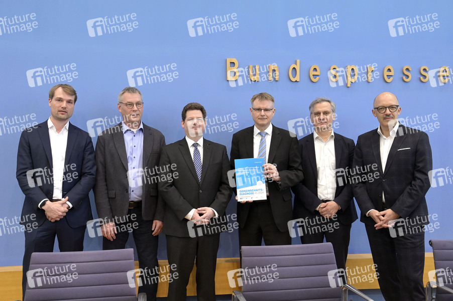 Timm Bönke, Oliver Holtemöller, Klaus-Jürgen Gern, Stefan Kooths, Torsten Schmidt und Timo Wollmershäuser bei der Bundespressekonferenz Gemeinschaftsdiagnose der Wirtschaftsforschungsinstitute Frühjahr 2024 im Haus der Bundespressekonferenz. Berlin, 27.03.2024