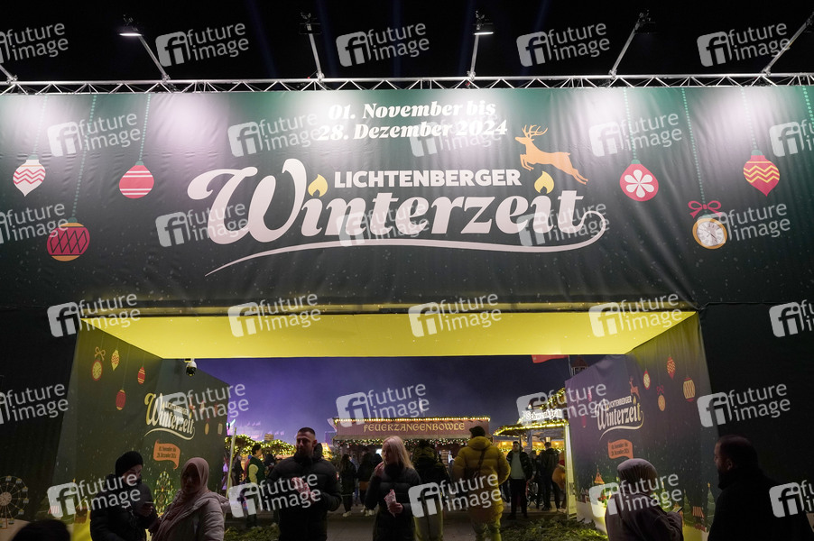 Eingang zum Weihnachtsmarkt 'Lichtenberger Winterzeit' an der Landsberger Allee im Berliner Bezirk Lichtenberg. Berlin, 03.11.2024