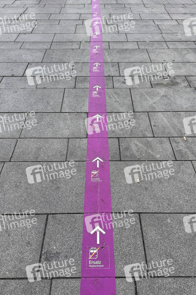 Im Rahmen von Streckenmodernisierungen oder Störungen des Eisenbahnbetriebes, richtet die Bahn einen Schienen-Ersatzverkehr mit Bussen ein. Hierdurch verlängert sich die Reisezeit oft erheblich zum Beispiel durch Verkehrsstaus auf den Straßen. Die Bushaltestellen zum Schienen-Ersatzverkehr werden in den Bahnhöfen durch auffällige Hinweisbanner und Schilder hingewiesen. (Symbolfoto, Themenfoto) Köln, 17.05.2025