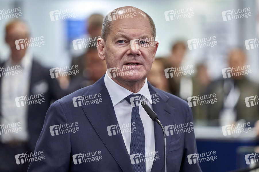 Olaf Scholz beim Pressestatement nach dem Eröffnungsrundgang auf der Hannover Messe 2024 auf dem Messegelände. Hannover, 22.04.2024