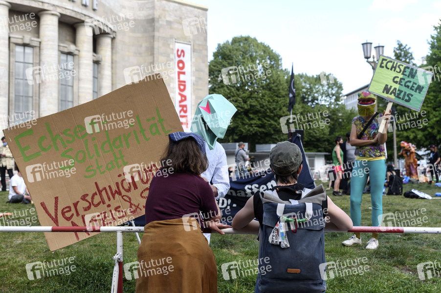 Im Echsenkostüm demonstrieren Mitglieder der Bergpartei gegen die Prosteste der 'Kommunikationsstelle Demokratischer Widerstand Berlin' gegen die Einschränkung der Grundrechte durch die Corona-Eindämmungsverordnung im Rahmen Infektionsschutzes rund um die Berliner Volksbühne. Diese 7. Hygienedemo war mit mehreren Veranstaltungen angemeldet. An dem Protest beteiligten sich auch Verschwörungstheoretiker und Impfgegner, aber auch rechte Gruppierungen. Am Rande kam es zu einigen Festnahmen. Berlin, 09.05.2020
