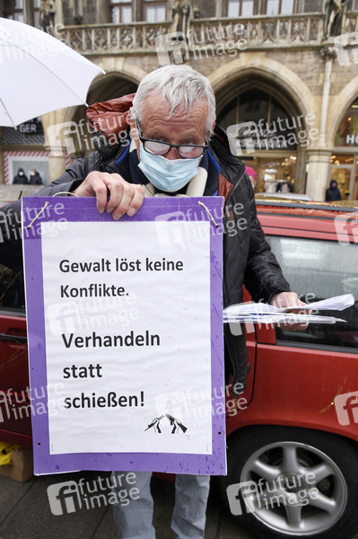 Konstantin Wecker bei der Kundgebung gegen die geplante Steigerung der Rüstungsausgaben unter dem Motto 'Abrüsten statt Aufrüsten' im Rahmen des bundesweiten Aktionstages gegen Aufrüstung und Krieg am Marienplatz. München, 05.12.2020