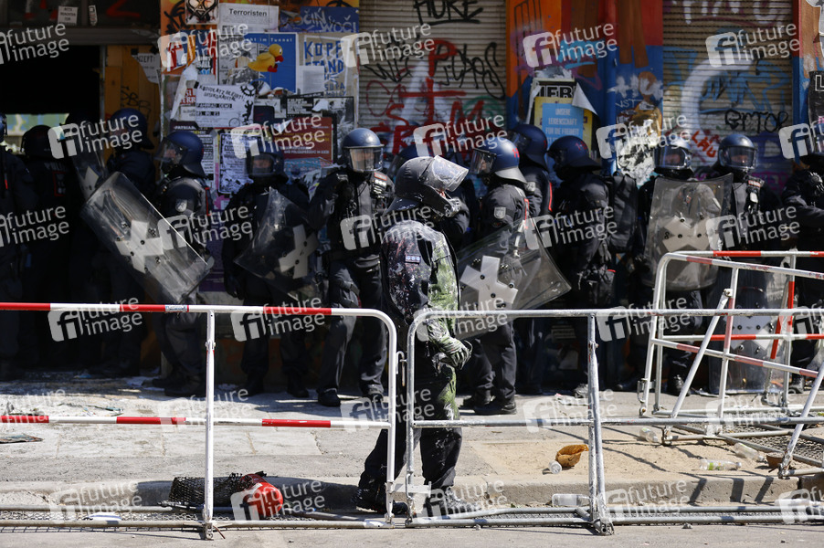 Im teilbesetzten Haus in der Rigaer Straße 94 sollte am Donnerstag der Brandschutz überprüft werden. Nachdem die Bewohner sich zunächst weigerten, die Tür zu öffnen, verschaffte sich die Polizei gewaltsam Zutritt und wurde mit Farbe beworfen. (Quelle: rbb online) Berlin, 17.06.2021