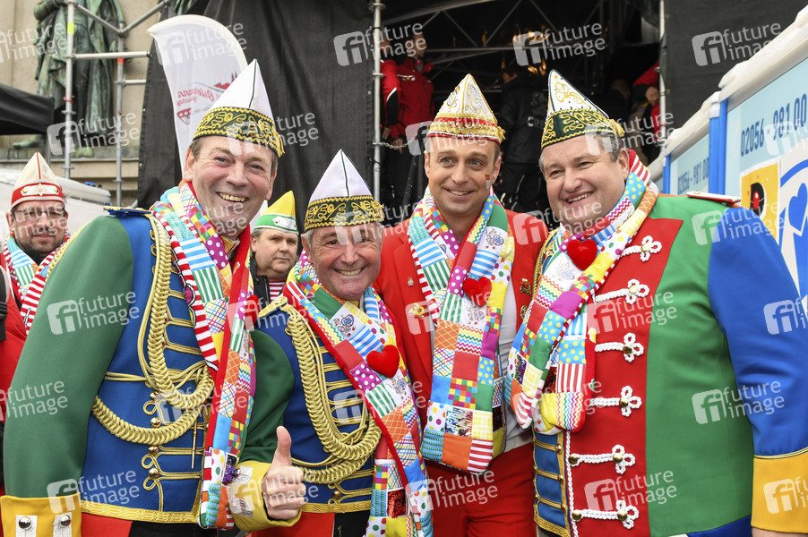 Das Dreigestirn Christian Krath / Prinz Christian II, Frank Breuer / Bauer Frank und Ralf Schumacher / Jungfrau Griet mit Lukas Wachten beim Auftakt des Kölner Karnevals auf dem Heumarkt. Köln, 11.11.2019