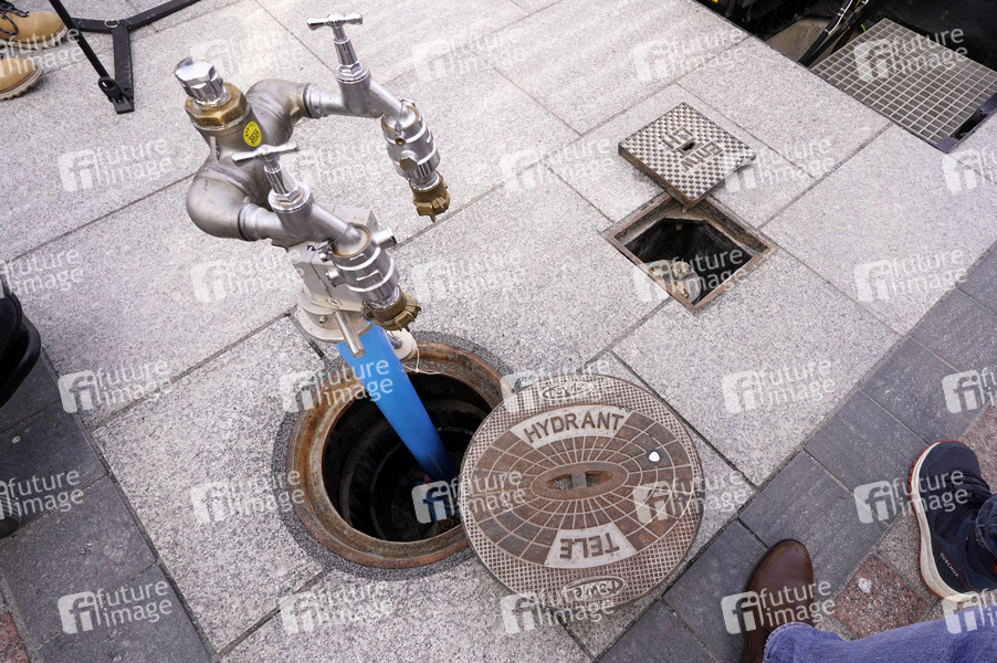 Ein versenkbarer Hydrant bei der Wiedereröffnung vom Gendarmenmarkt nach zweijähriger Sanierung. Berlin, 13.03.2025