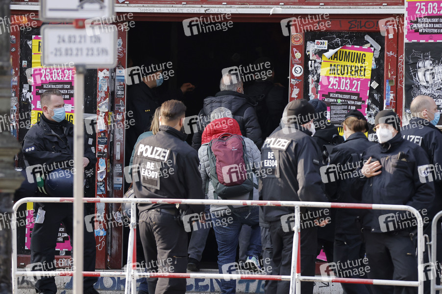 Gegen 8.30 Uhr wurde die Kiezkneipe 'Meuterei' in Kreuzberg von der Polizei geräumt. Linke Gruppen haben für Donnerstag fünf Demos, davon drei mit dem Zielort vor der besetzten Kneipe, angekündigt. Seit Mittwochnachmittag hat die Polizei deshalb eine Sperrzone um die Kneipe gezogen. 1100 Einsatzkräfte sicherten die Räumung der Kiezkneipe ab. Berlin, 25.03.2021