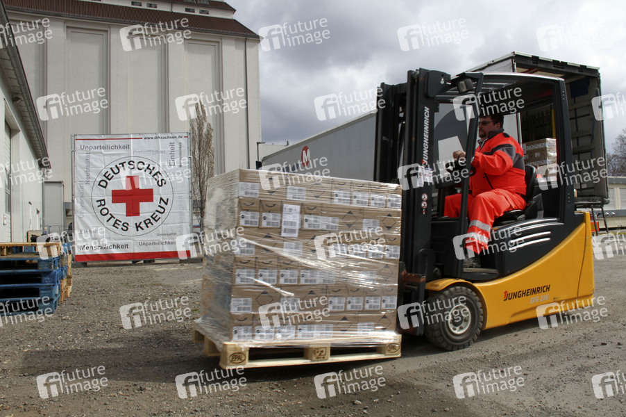Empfang einer Großspende von Händedesinfektionsmittelm der Beiersdorf AG an den Freistaat Sachsen bei der DRK Logistik HUB Sachsen GmbH. Dresden, 31.03.2020