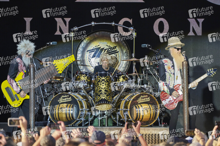 Elwood Francis, Frank Beard und Billy Gibbons von ZZ Top live beim Sommerfestival 2024 unter dem Motto 'Beats, Bands und Beach' in der Autostadt. Wolfsburg, 13.07.2024
