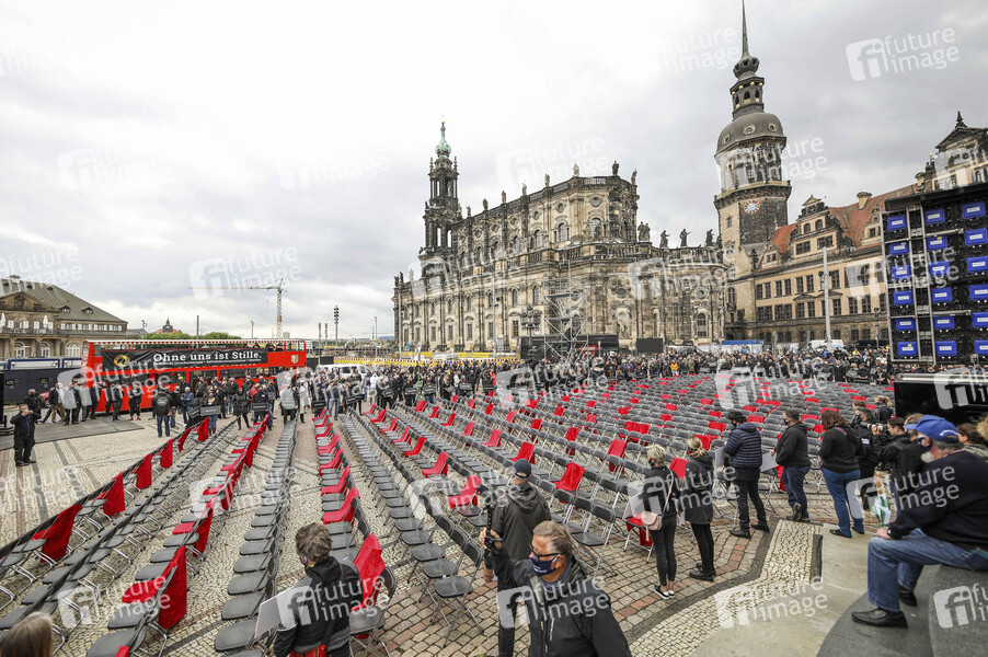 1000 leere Stühle bei der Demonstration 'Ohne uns ist Stille' der Organisation 'Leere Stühle' auf dem Theaterplatz in der historischen Dresdner Altstadt. Künstler, Veranstalter und Unternehmen der Veranstaltungsbranche wie Caterer und Techniker demonstrieren gemeinsem, um auf die Probleme und Wichtigkeit ihrer Branche aufmerksam zu machen. Dredsen, 05.06.2020