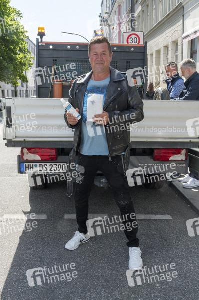 Rene Zierl bei der Verteilung von 1.000 Stück FFP2 Schutzmasken und 1.000 Fläschchen Desinfektionsmittel in Kooperation mit Riedel Schmiermittel und HDS GaLaBau an Hilfsbedürftige auf dem Kiez St. Pauli. Hamburg, 30.05.2020