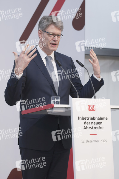 Patrick Schnieder bei der Inbetriebnahme der neuen Ahrtalbahn mit Sonderfahrt von Dernau nach Altenahr. Altenahr, 12.12.2025
