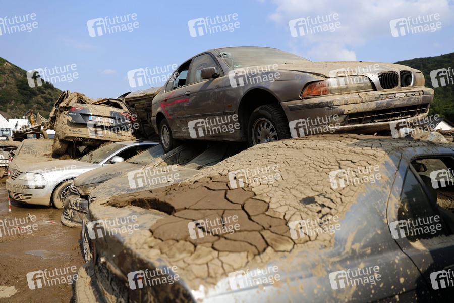 Nach dem Jahrhunderthochwasser in der Eifel durch heftige Regenfälle und Dauerregen mit Überschwemmungen und Überflutungen haben die Aufräumarbeiten im Ahrtal begonnen. Einheiten von Polizei, THW, Bundeswehr und Feuerwehr mitsamt vielen freiwilligen Helfern räumen Straßen, entfernen Schutt und Schlamm und versorgen die Menschen. Im Bild zerstörte Autos in der Ortschaft Dernau, in der die Flut viele Häuser zerstörte, 22.07.2021