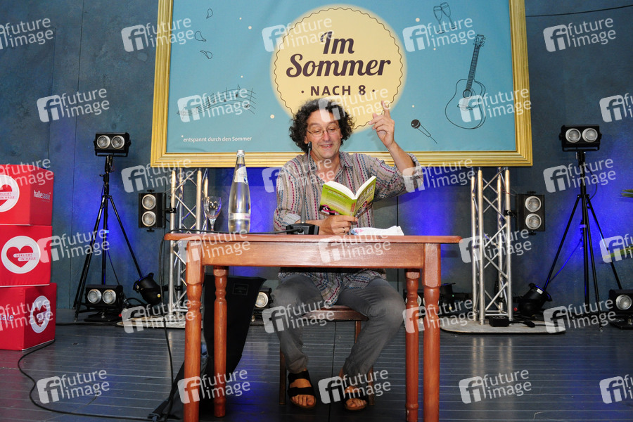 Peter Godazgar bei einer Lesung im Rahmen der Veranstaltungsreihe 'Im Sommer nach 8' im Hof des Neuen Theaters. Halle/Saale, 09.08.2020