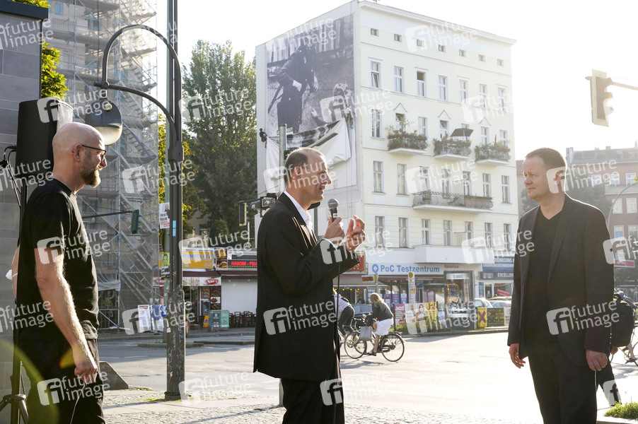 Moritz van Dülmen, Axel Klausmeier und Klaus Lederer bei der Installation eines Großfotos zum 60. Jahrestag des Mauerbaus von Kulturprojekte Berlin und der Stiftung Berliner Mauer am Hermannplatz. Berlin, 13.08.2021