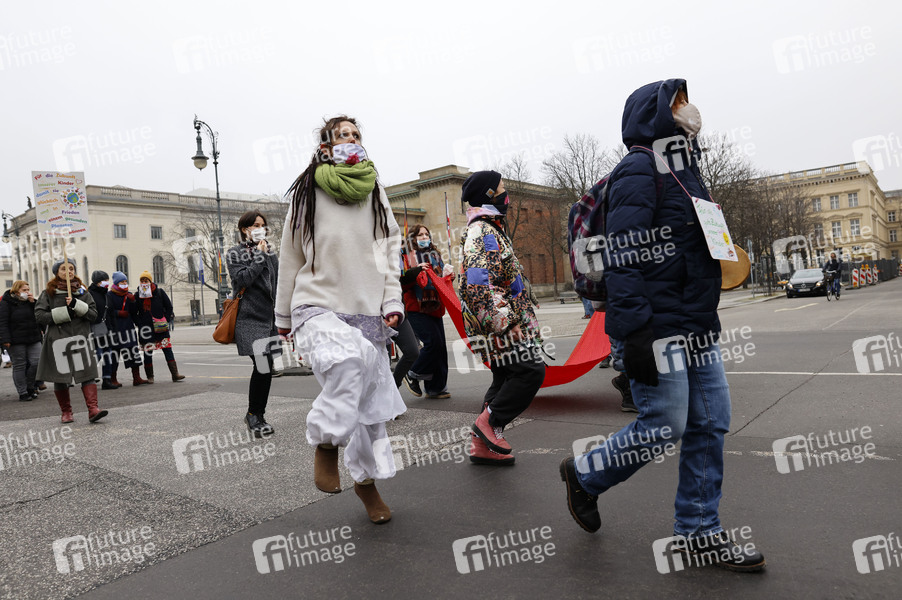 Unter dem Motto 'Gemeinsam in eine lebendige Zukunft' findet ein multikultureller Frauenmarsch vom Brandenburger Tor über das Rote Rathaus zum Gendarmenmarkt statt. Berlin, 28.02.2021