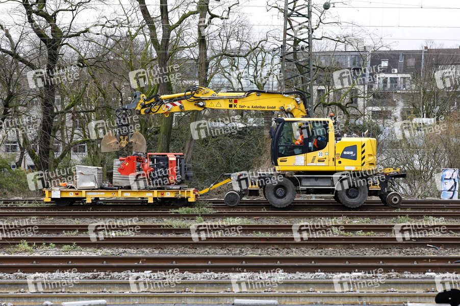 Zweiwegebagger beim Fototermin 'Endspurt für das Elektronische Stellwerk (ESTW) Linker Rhein' am Bahnhof Köln-West. Köln, 13.03.2024