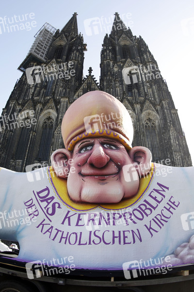 Künstler, Karneval, Karnevalswagenbauer, Skulptur, Plastik, Erzbistum Köln, Kölner Dom, Domstadt, Kirchenskandal, Kindesmissbrauch, Missbrauch, Aufarbeitung, Verzögerung, Verschleppung, Gutachten, Vertrauenskrise, Erzbischof, Kardinal, Gutachter, Missbrauchsfälle, Opfer, Entschädigung, unter Verschluss, Verdachtsfälle, Kirche, Kirchenaustritte, Kirchenaustritt, Kirchensteuer, Glaube, Konfession, Religion, Katholiken, Austrittswelle, katholische Kirche, Erzbischof Reiner Maria Woelki, Kardinal, Karikatur, Kirchenkritik, Kirchenkritiker, Priester, Pfaffen, Klerus, Sexualmoral, Motivwagen, Scheinheiligkeit, Bischofskonferenz, Bistum, Missbrauchsskandal, Symbolbild, Symbolfoto, Themenbild