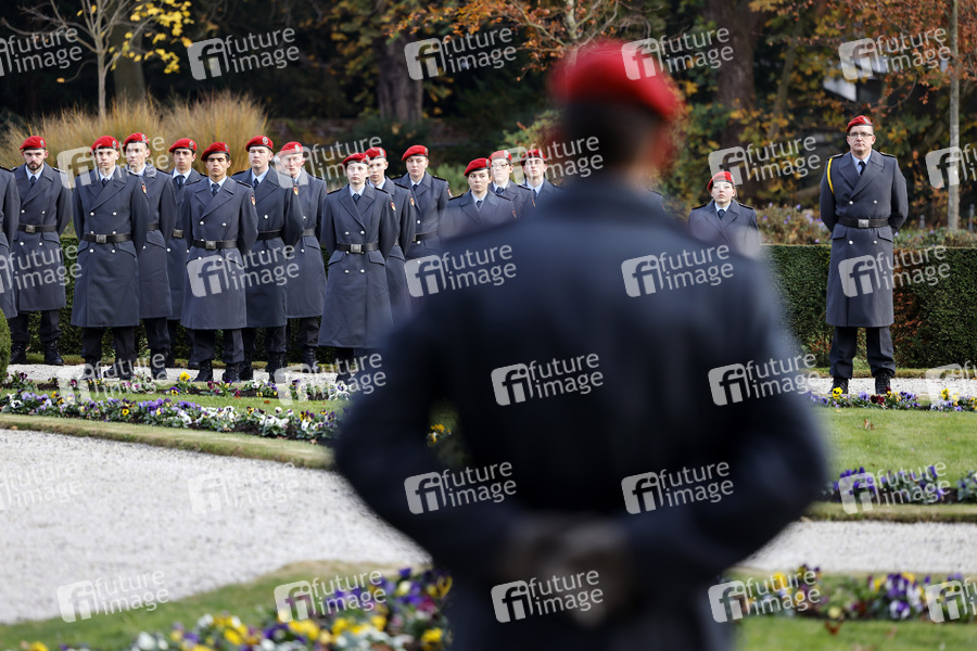 Rekruten und Rekrutinnen nehmen anlässlich des 66. Gründungs-jahres der Bundeswehr am feierlichen Gelöbnis vor der Villa Hammerschmidt in Bonn teil. 50 Soldatinnen und Soldaten des ABC-Abwehrbataillons 7 aus Höxter und des ABC-Abwehrbataillons 750 aus Bruchsal legen hier ihr Gelöbnis ab. Bonn, 12.11.2021