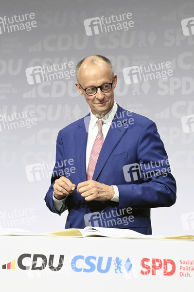Friedrich Merz bei der Unterzeichnung des Koalitionsvertrages zwischen CDU, CSU und SPD im Gasometer Schöneberg. Berlin, 05.05.2025