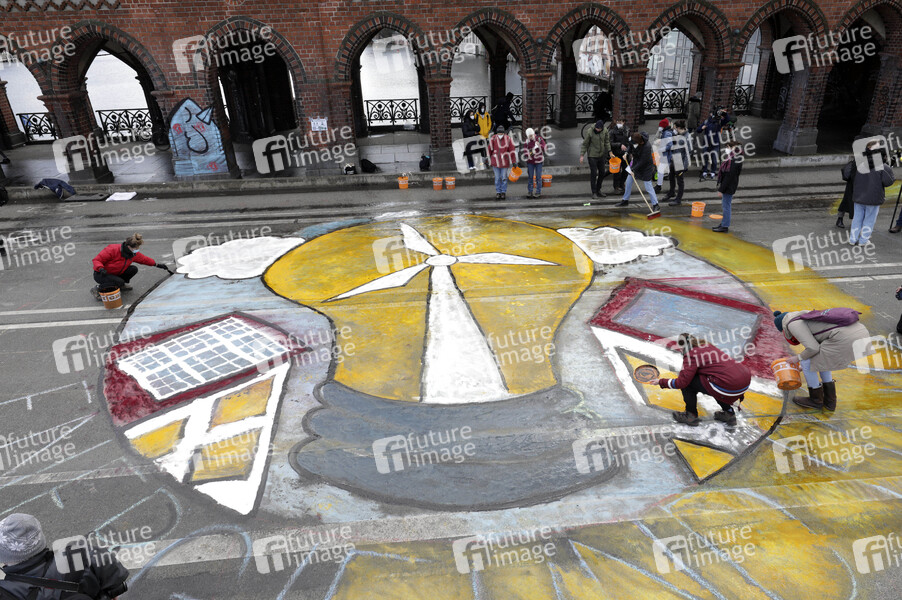 Am Freitag finden mehrere Demonstrationen zum globalen Klimastreik von Fridays for Future in Berlin statt. An der Oberbaumbrücke bemalen Aktivisten die Straße zum Thema 'Another World is possible'. Berlin, 19.03.2021