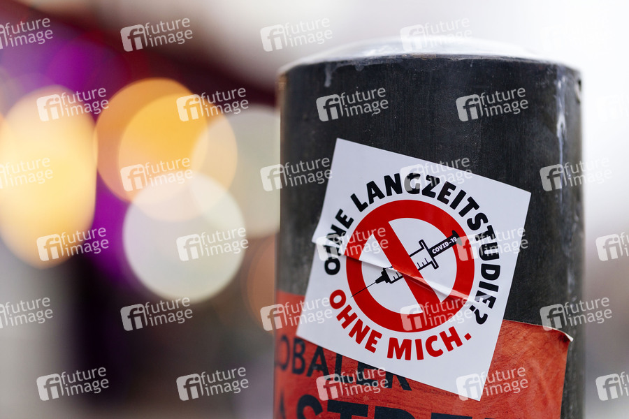 Ein Sticker mit der Aufschrift 'Ohne Langzeitstudie? Ohne mich.' weist auf Vorbehalte gegenüber Impfmitteln hin, die eine Notfallzulassung erhielten und deren Landzeitschäden nicht erforscht sind. (Themenbild, Symbolbild) Köln, 28.01.2021