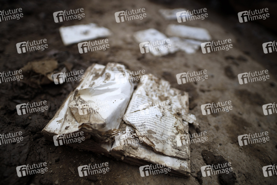 Nach dem Jahrhunderthochwasser in der Eifel durch heftige Regenfälle und Dauerregen mit Überschwemmungen und Überflutungen haben die Aufräumarbeiten im Ahrtal begonnen. Einheiten von Polizei, THW, Bundeswehr und Feuerwehr mitsamt vielen freiwilligen Helfern räumen Straßen, entfernen Schutt und Schlamm und versorgen die Menschen. Im Bild zerstörte Bücher in der Ortschaft Altenahr, in der die Flut viele Häuser zerstörte, 22.07.2021