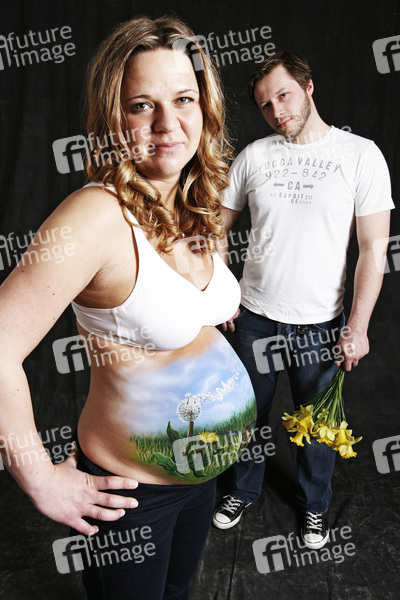 Bodypainting, Erotik, Frau, Mann, fast nackt, drinnen, weiblich, männlich, Körperkunst, Kunst, Malerei, Paar, schwanger, Bauch, Blumen, erotic, woman, man, nude, indoor, female, body art, body painting, pregnant, couple, flowers