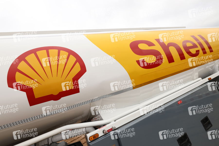 Shell-Logo auf einem Tankwagen bei der Eröffnung der Baustelle für Deutschlands größte Anlage zur Herstellung von Bio-Flüssiggas auf dem Gelände des 'Shell Energy an Chemicals Park Rheinland'. Köln, 09.02.2022