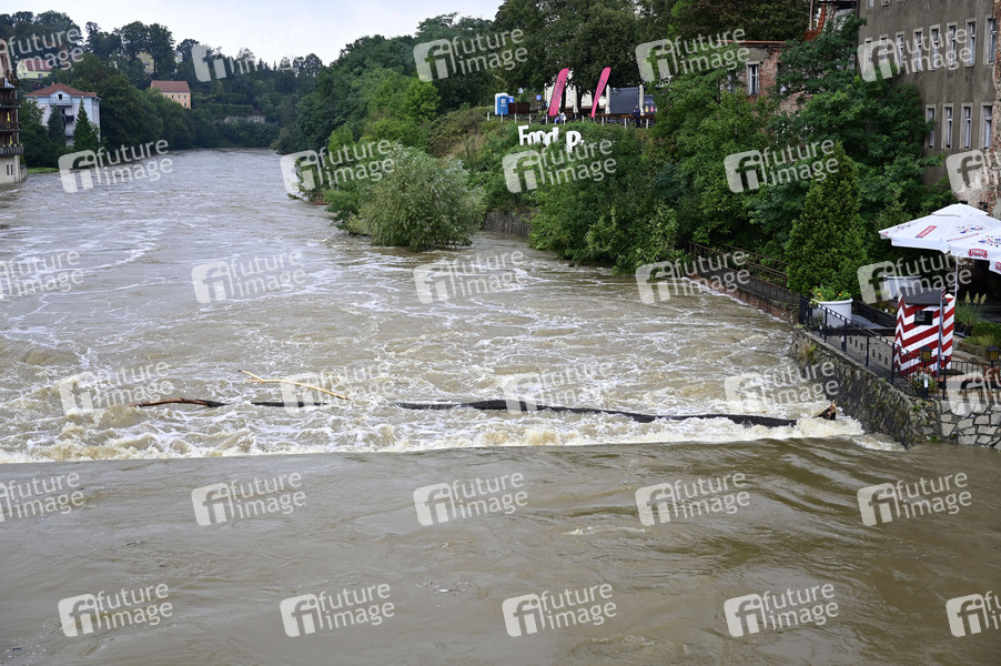 Das Wehr an der Vierradenmühle an der Altstadtbrücke. An der Neiße in Görlitz wurde am Morgen um 8:00 Uhr der Scheitelpunkt erreicht. Bei einem Wert von 5,57 m, bei einem Durchfluss von 309 m3/s, lag dieser 3 Zentimeter unterhalb der Alarmstufe 4. Seit dem geht der Wasserstand der Neiße langsam zurück. Der aktuelle Pegelstand beträgt 5,18 m. Görlitz, 16.09.2024