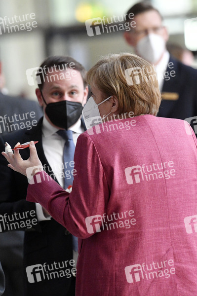 Angela Merkel bei einer namentlichen Abstimmung im Rahmen der 223. Sitzung des Deutschen Bundestages im Reichstagsgebäude. Berlin, 21.04.2021