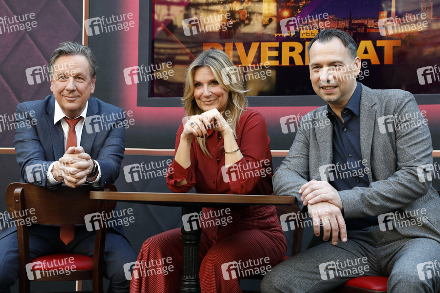 Jörg Kachelmann, Kim Fisher und Sebastian Fitzek beim Pressetermin zur MDR/rbb-Talkshow 'Riverboat' in der Riverboat-Kulisse im Mediengarten der Media City Leipzig. Leipzig, 08.10.2021