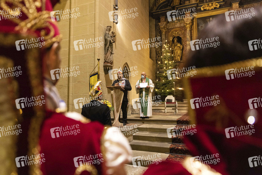 Der karnevalistische Gottesdienst fand unter 3G-Bestimmungen in der Severikirche auf dem Erfurter Domberg statt. Pfarrer Michael Neudert, gab den Karnevalisten, einschließlich den Prinzenpaaren Christian II. und Verena II. und den Kindern Luca I. und Noelanie I. den Segen für die anstehende Kampagne. (Person im Bild: Pfarrer Michael Neudert). Erfurt, 16.01.2022