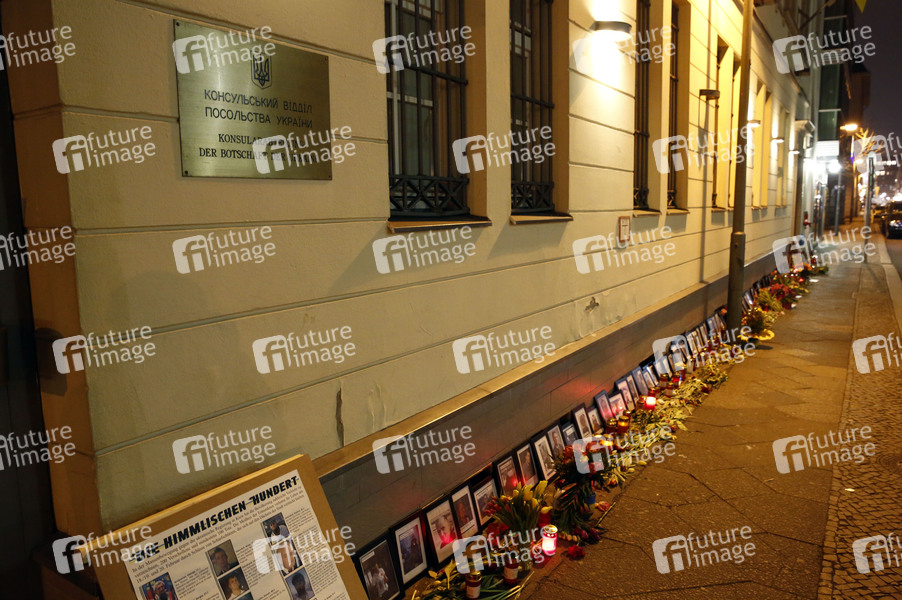 Kerzen, Blumen und Fotos vor der Ukrainischen Botschaft zum Gedenken an die 'Maidan-Opfer' in Kiew. Berlin, 04.03.2014
