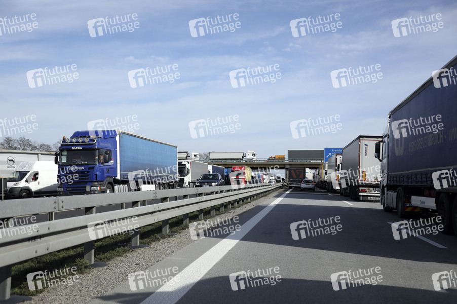 LKWs stehen auf der A12 in Fahrtrichtung Polen im Stau. Die Grenzen zwischen Polen und Deutschland sind wegen des Coronavirus geschlossen. Frankfurt (Oder), 16.03.2020
