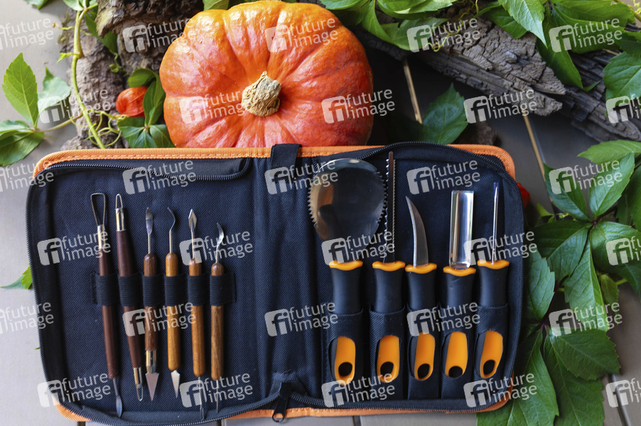 Kürbis schnitzen, Kürbisse, Cucurbita, Halloween, Herbst, Kürbisfruchtfleisch, Kürbiswände, Kürbis Gesicht, Kürbis-Schnitzset, Deko, Symbolbild, Themenbild