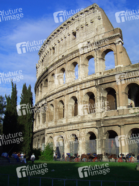 Antiker Name: Amphitheatrum Novum oder Amphitheatrum Flavium, der größte geschlossene Bau der römischen Antike, Fertigstellung im Jahr 80, es konnten ca. 50.000 Zuschauer Platz finden, das Kolosseum ist ellipsenförmig gebaut, Breite: 156 Meter, Länge: 188 Meter, Umfang: 527 Meter, Höhe: 48 Meter, es bestand aus drei übereinander angeordneten Arkadenreihen zu je 80 Bögen, als Arena war das Kolosseum über 400 Jahre lang in Betrieb, Veranstaltungsort von in aller Regel höchst grausamen Spielen, üblich waren vor allem Gladiatorenkämpfe (munera) und Tierhetzen (venationes)