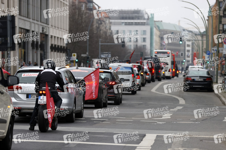 Nach 365 Tagen Lockdown in der Veranstaltungswirtschaft findet heute eine Auto-Demonstration zur Rettung der Veranstaltungswirtschaft vom Aktionsbündnis 'Alarmstufe Rot' statt. Die Route führt u.a. am Bundesministerium der Finanzen vorbei. Berlin, 28.02.2021