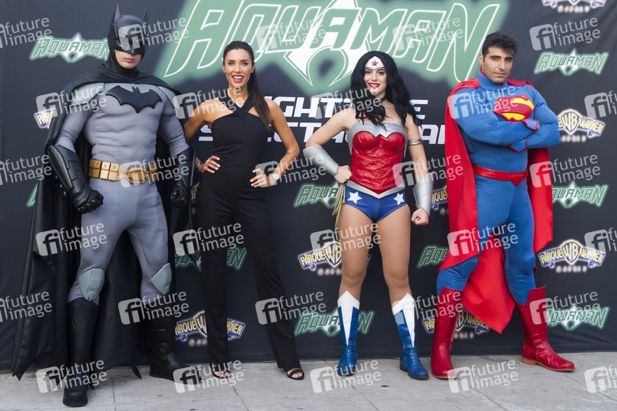 Pilar Rubio mit Batman, Wonder Woman und Superman beim Fototermin zur Eröffnung der Sommer-Saison des Parque Warner Beach. Madrid, 13.06.2019