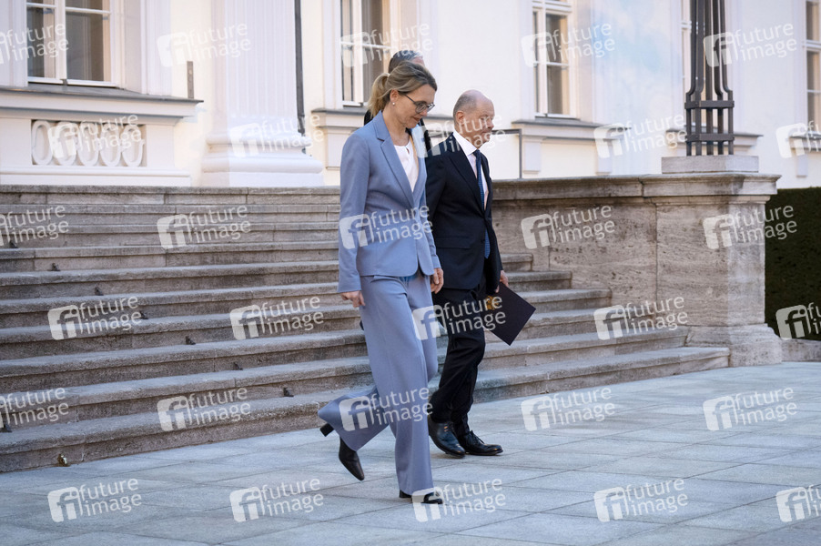 Olaf Scholz beim Verlassen des Schloss Bellevue nach Aushändigung der Entlassungsurkunde durch den Bundespräsidenten. Berlin, 25.03.2025