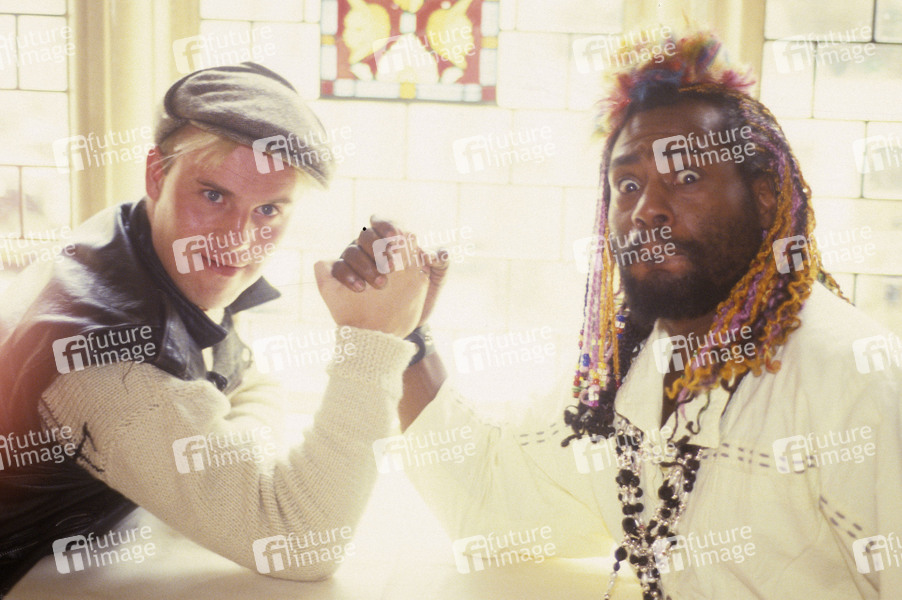 Thomas Dolby und George Clinton von Dolby's Cube bei einem Pressetermin im Belfry Club. London, 04.07.1985
