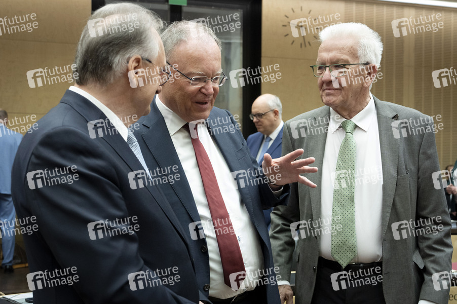 Reiner Haseloff, Stephan Weil und Winfried Kretschmann in der 1053. Sitzung des Bundesrates im Plenarsaal des Preußischen Herrenhauses. Berlin, 11.04.2025