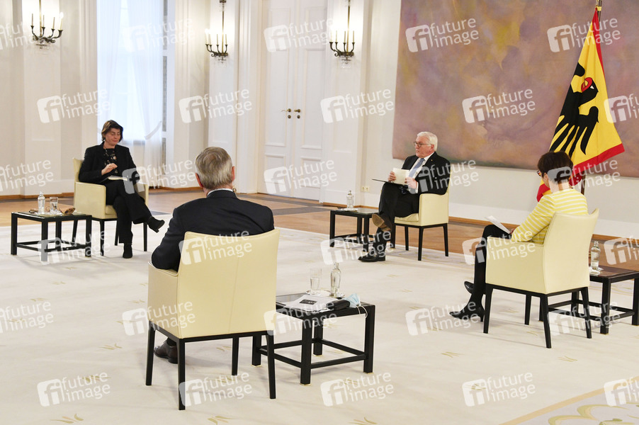 Christina Morina, Eckart Conze, Frank-Walter Steinmeier und Helene Miard-Delacroix bei der Ansprache des Bundespräsidenten und Gespräch mit Historikerinnen und Historikern zum 150. Jahrestag der Gründung des Deutschen Reiches im Schloss Bellevue. Berlin, 13.01.2021