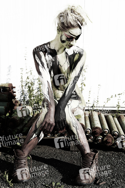 Bodypainting und Photoshooting mit Model Jutta auf einem Industriegelände in Hameln. Bodypaint-Künstler: Jörg Düsterwald, Make-Up und Hairstyling: Nadja Lück