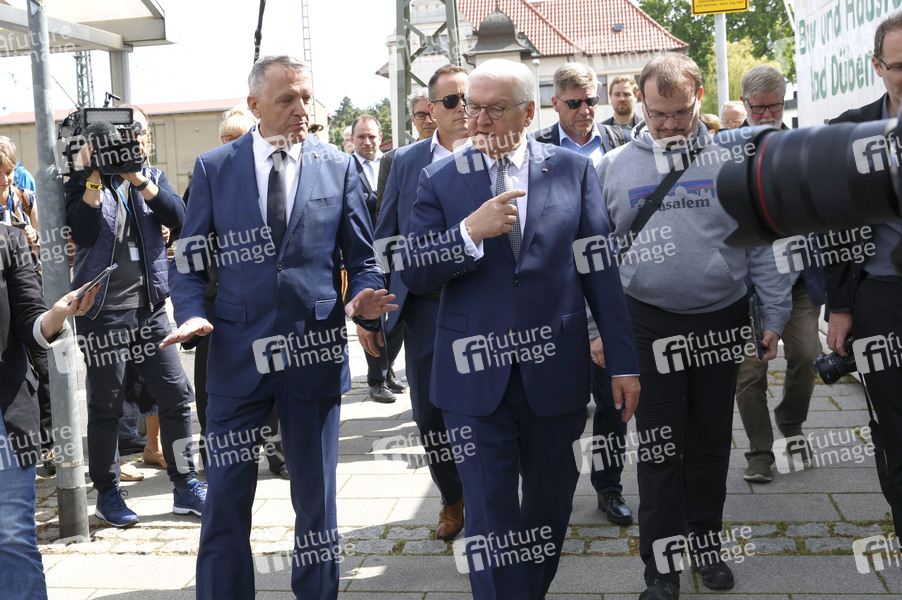 Frank-Walter Steinmeier mit Bürgermeister Manfred Wilde auf dem Weg durch die Stadt Delitzsch zum Rathaus. Steinmeier verlegt seinen Amtssitz für drei Tage nach Sachsen. Der Besuch im Landkreis Nordsachsen ist Teil der Reihe 'Ortszeit Deutschland', bei der das Staatsoberhaupt regelmäßig in verschiedene Regionen reist, um mit Bürgerinnen und Bürgern ins Gespräch zu kommen und die Entwicklung vor Ort kennenzulernen. Delitzsch, 20.05.2025