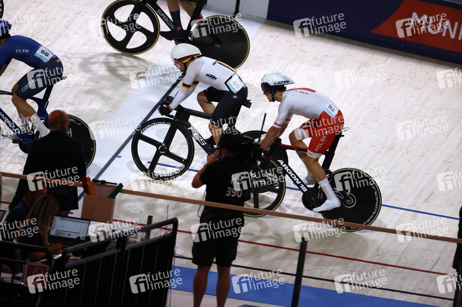 Moritz Malcharek und Bartosz Rudyk im Scratch 15km Männer Finale bei den European Championships 2022 im Bahnradsport in der Messe München. München, 13.08.2022