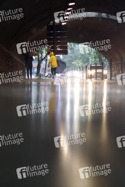 Anhaltende Regenfälle durch Tief Bernd haben in Köln und Umland zu Hochwasser, steigendem Rheinpegel und überfluteten Straßen, Kellern und Fahrbahnen geführt. Am Rheinboulevard überspülte das Wasser die Stufen. Feuerwehr und THW waren im Dauereinsatz. Der Deutsche Wetterdienst hatte zuvor vor extremen Dauerregen gewarnt. Köln; 14.07.2021