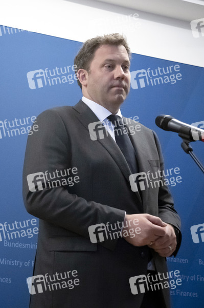 Lars Klingbeil beim Pressestatement zum Treffen des Bundesfinanzministers und des Exekutiv-Vizepräsidenten der Europäischen Kommission für Wohlstand- und Industriestrategie im Bundesfinanzministerium. Berlin, 26.05.2025