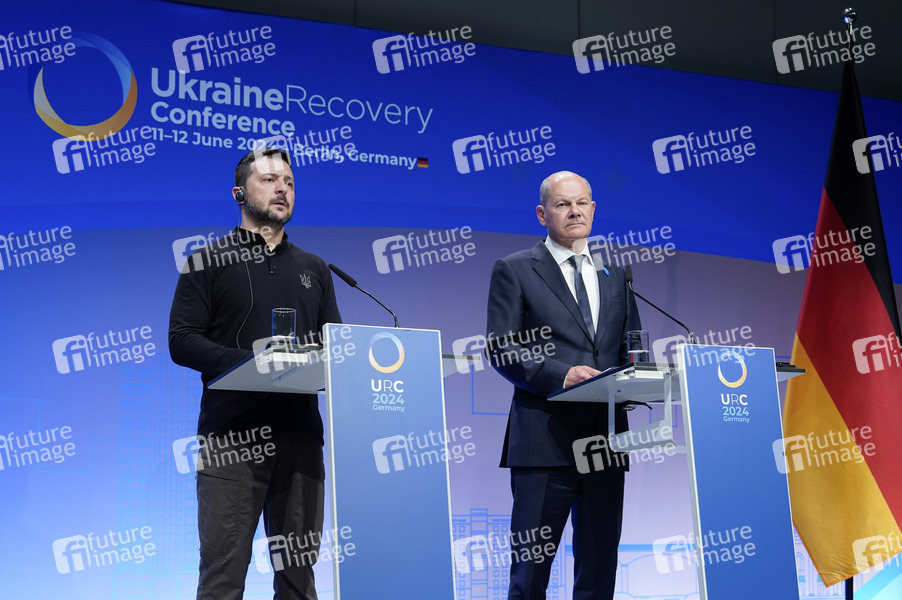 Wolodymyr Selenskyj und Olaf Scholz bei der Pressekonferenz zur Ukraine Recovery Conference 2024 unter dem Motto 'United in Defense. United in Recovery. Stronger together.', auf dem Messegelände. Berlin, 11.06.2024