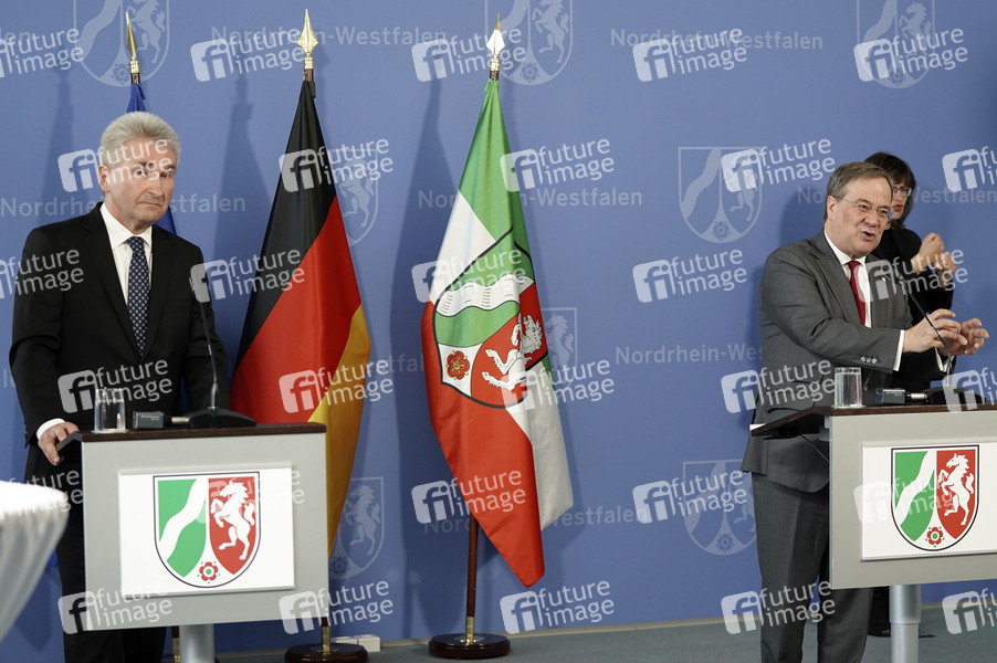 Politiker, FDP, Minister für Wirtschaft und Energie in NRW, CDU, Ministerpräsident von Nordrhein-Westfalen, Politik, Lockerungen, Maßnahmen, NRW, Presse-Briefing, PK, Pressekonferenz, Statement, Corona, Sars-CoV-2, Covid-19, Coronavirus, Coronaviren, Corona-Virus, Coronakrise, Corona-Krise, Coronamaßnahmen, Corona-Schutz, flatten the curve, Ausnahmesituation, Zeitgeschichte, Exit-Strategie