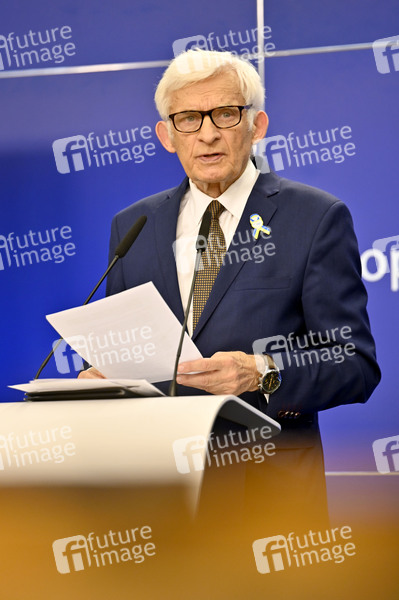 Jerzy Buzek bei einer Pressekonferenz zur Trilog-Vereinbarung zur Gasspeicherung im Europäischen Parlament. Brüssel, 19.05.2022